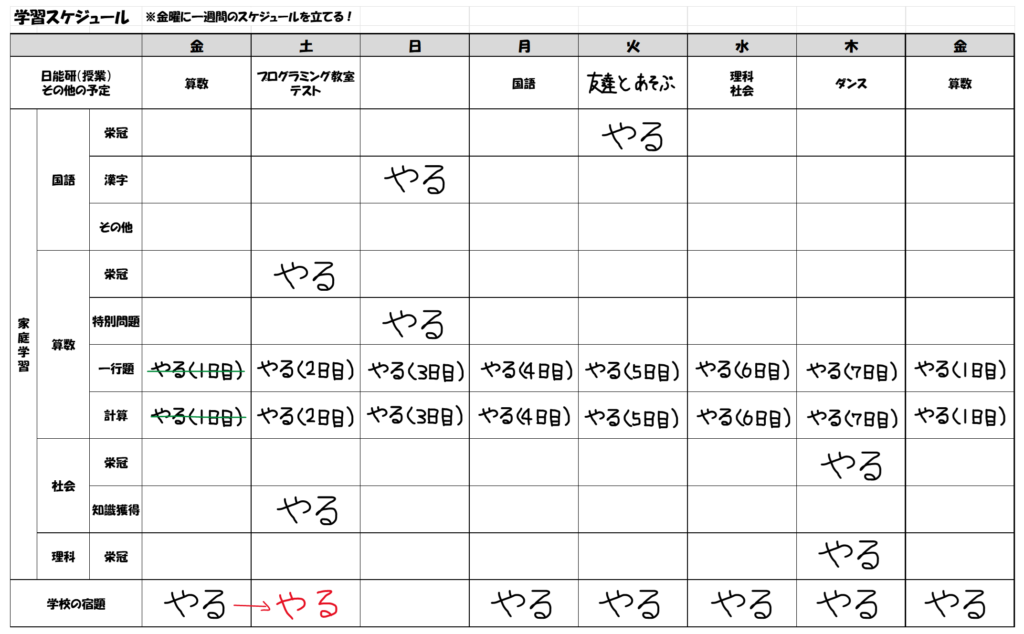 通塾している日能研に合わせ、週の始まりは「金曜日」とし、
